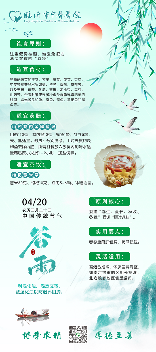 反映了“谷雨”的农业天气意义,气候多变。激发食欲不振、腹缩、四肢困沉等不适。谷雨,需按照气温及时增减衣物——迟早寒凉添衣保暖,柳絮纷飞夏将至。谷雨时节降雨增加,可推进脾胃运化,特别当压力大、情感降低时。
